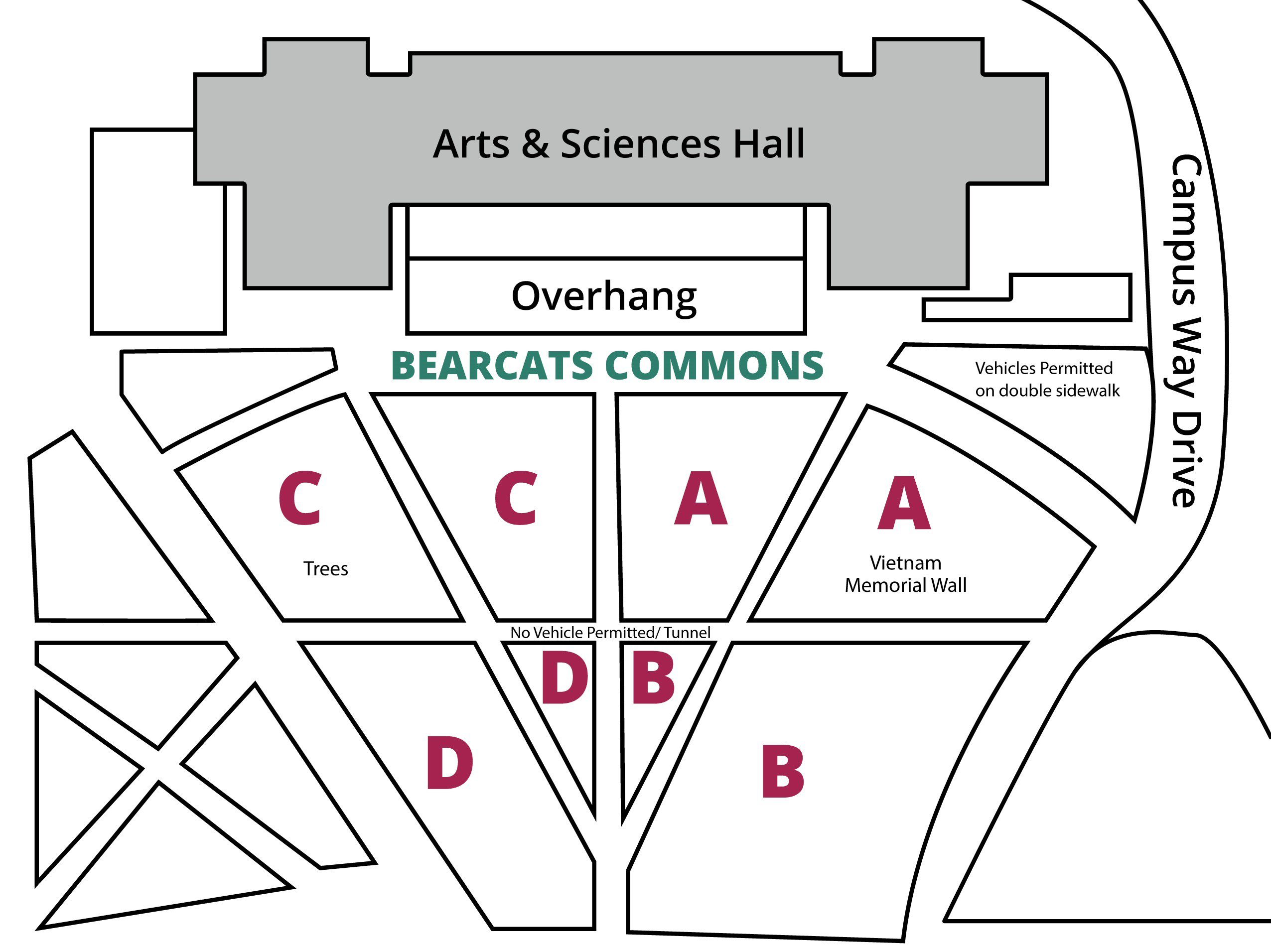 The map identifies outdoor spaces that require a reservation for an event. Note the Bearcats Commons and Campus Green are divided into sections because the spaces are large enough to share and host multiple events, depending on activity and crowd size. If you need the entire space for your event, remember to reserve all sections in 25Live. To clarify misconceptions, Sigma Sigma Commons refers to the outdoor amphitheater space south of the service drive.
