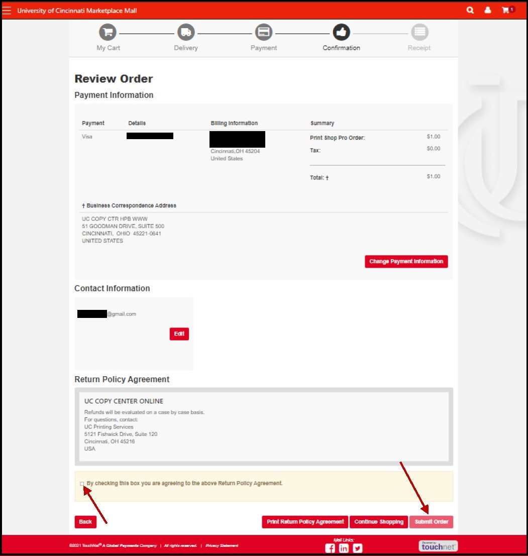 Finally, ensure that all your billing information and your payment amount are correct, then check the box that indicates your agreement with the return policy and click Submit Order.