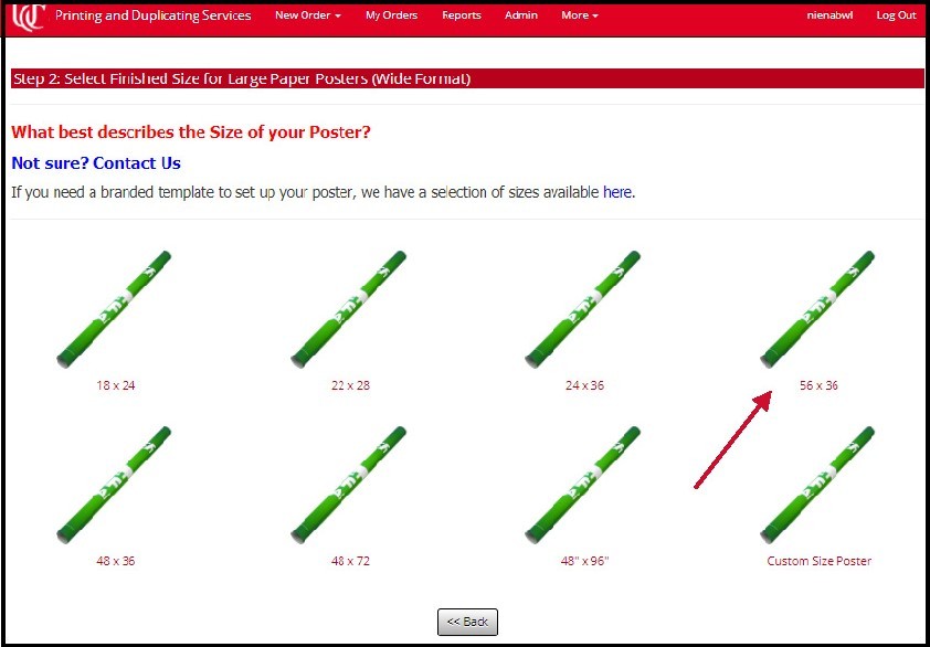 Click the icon that describes the size poster you need to order. For this example, let’s order a 56” x 36” poster, and when we reach the appropriate page we’ll add gloss laminate.