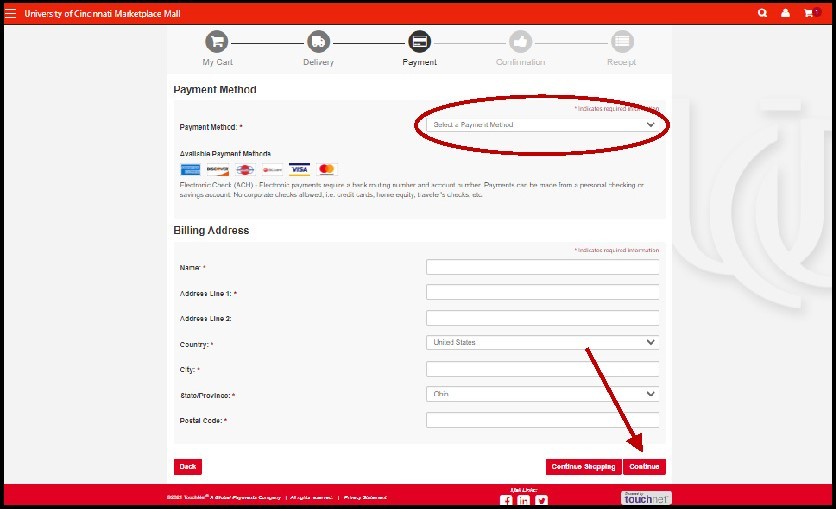 Fill in your credit card or ACH information, and all the Billing Address information, then click Continue. All fields under Billing Address are required, except Address Line 2.