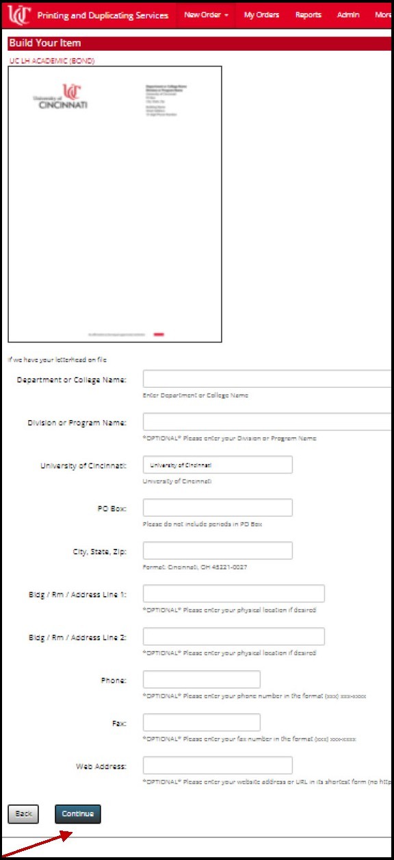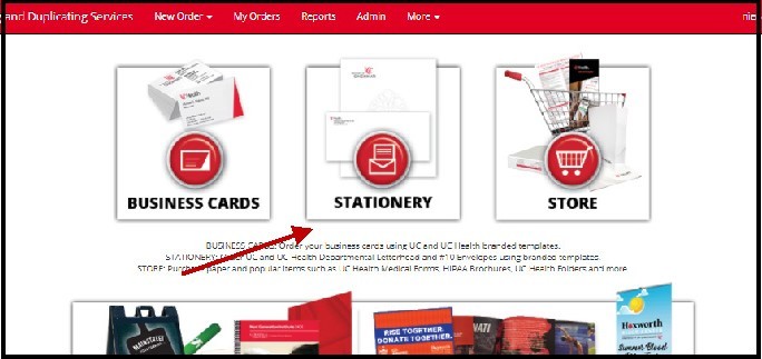 Order all your stationery, whether by using a template to enter your department’s information, or placing an order based on your letterhead or envelope designs that are already on file at Printing Services. You will only see the stationery relevant to your particular site (UC or UC Health).