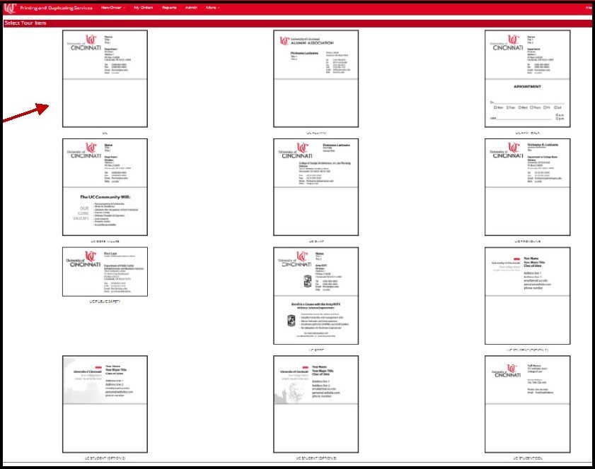 Select Business Cards from the Print Order Desk home page, or choose Business Cards from the New Order drop-down menu in the red header bar. You will be taken to the business card template page, where the options visible to you will depend upon the privileges assigned to your chosen site (UC or UC Health). We’ll order UC cards for this example.
