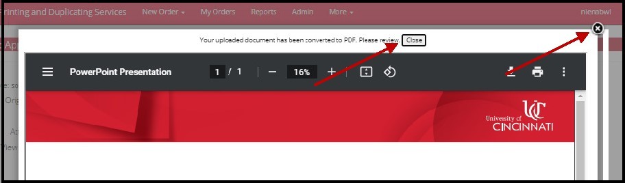 Click Attach File, and your attachment will be displayed (I’ve just attached a blank UC branded poster template for the example). Click either the Close button at the top center, or the X button at the top right corner to close the window.