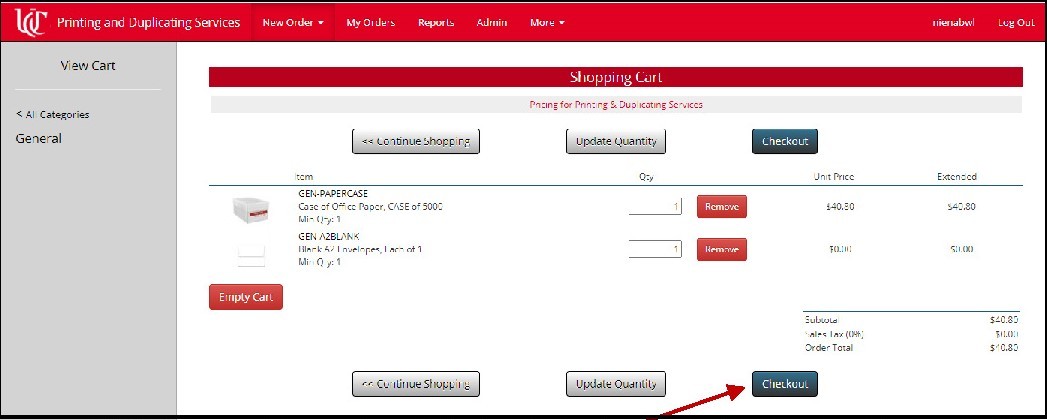 You will return to your shopping cart, where you will see the envelopes added below your case of paper. Once again, you have the option to change and Update the quantities of both items. If everything is good, click Checkout.
