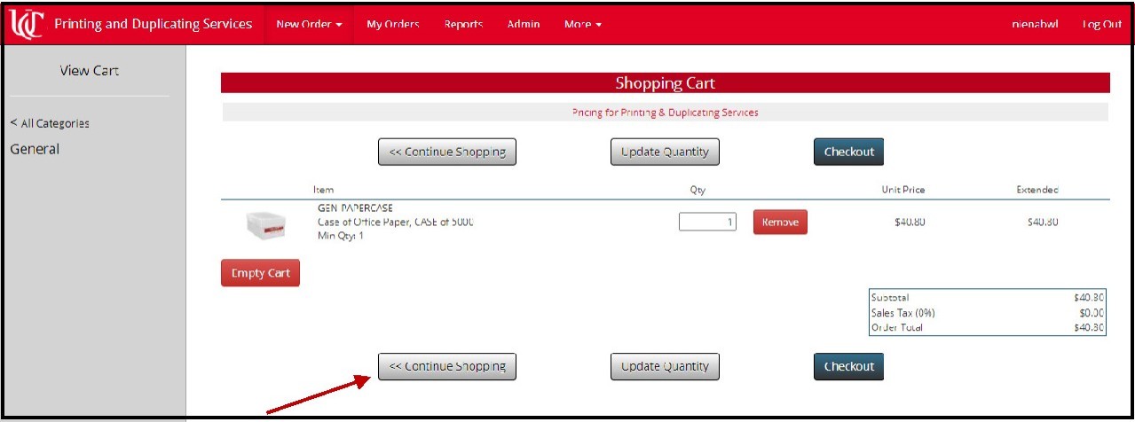 Your shopping cart will be displayed. If you need more than one case, you can edit the quantity, then click either of the Update Quantity buttons. If you change your mind, you can click Empty Cart.