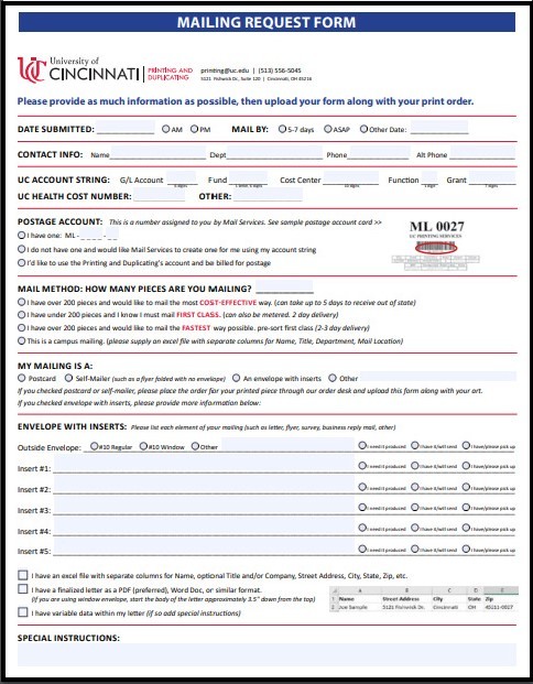 Open the file using Adobe Acrobat or Acrobat Reader. Once you have completed all the information about your mailing, resave the file. Then, when you place your print order, please attach this file to the order as well as your print file. As soon as our staff has calculated the cost of postage for the mailing they will add it to your order, and you will receive a quote for the entire job (both print and postage costs).