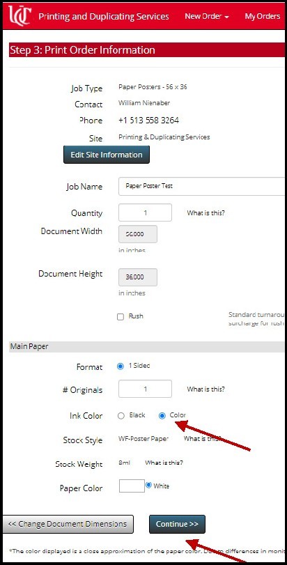 Next, indicate whether your poster will be all black ink or color. This is the last choice for this page of the order form. Click Continue.