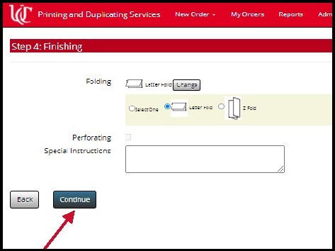 On the next page, you will select the type of fold you want, and whether perforation is needed. You may also add any special instructions if you like. Click Continue.