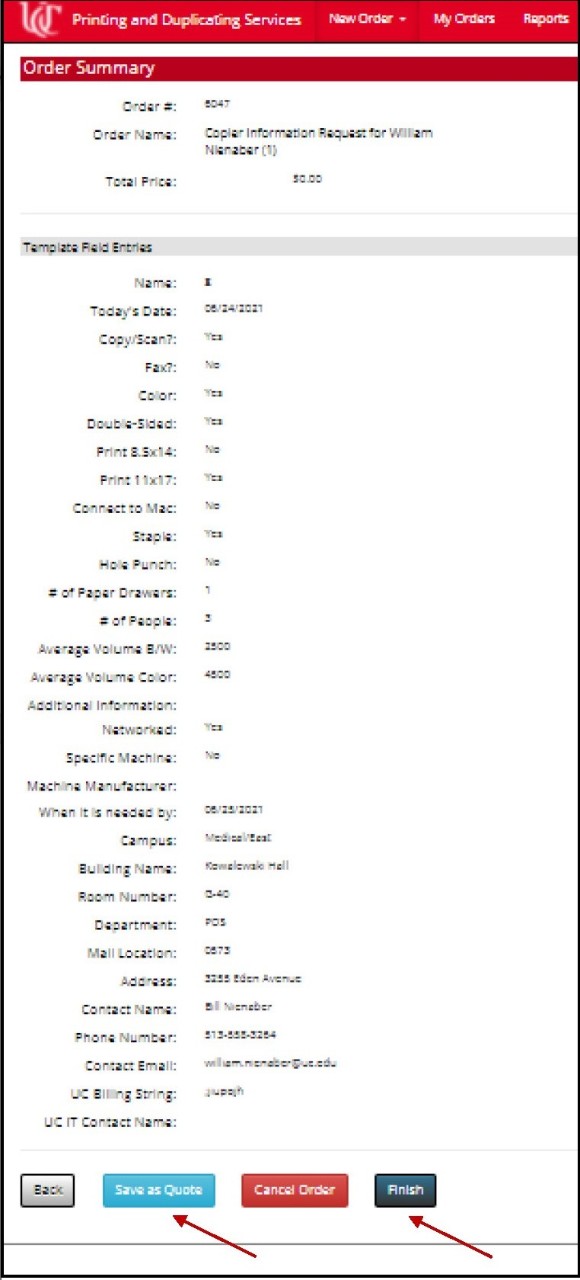 Your order summary will be displayed. You can click either Save as Quote or Finish to complete the submission.