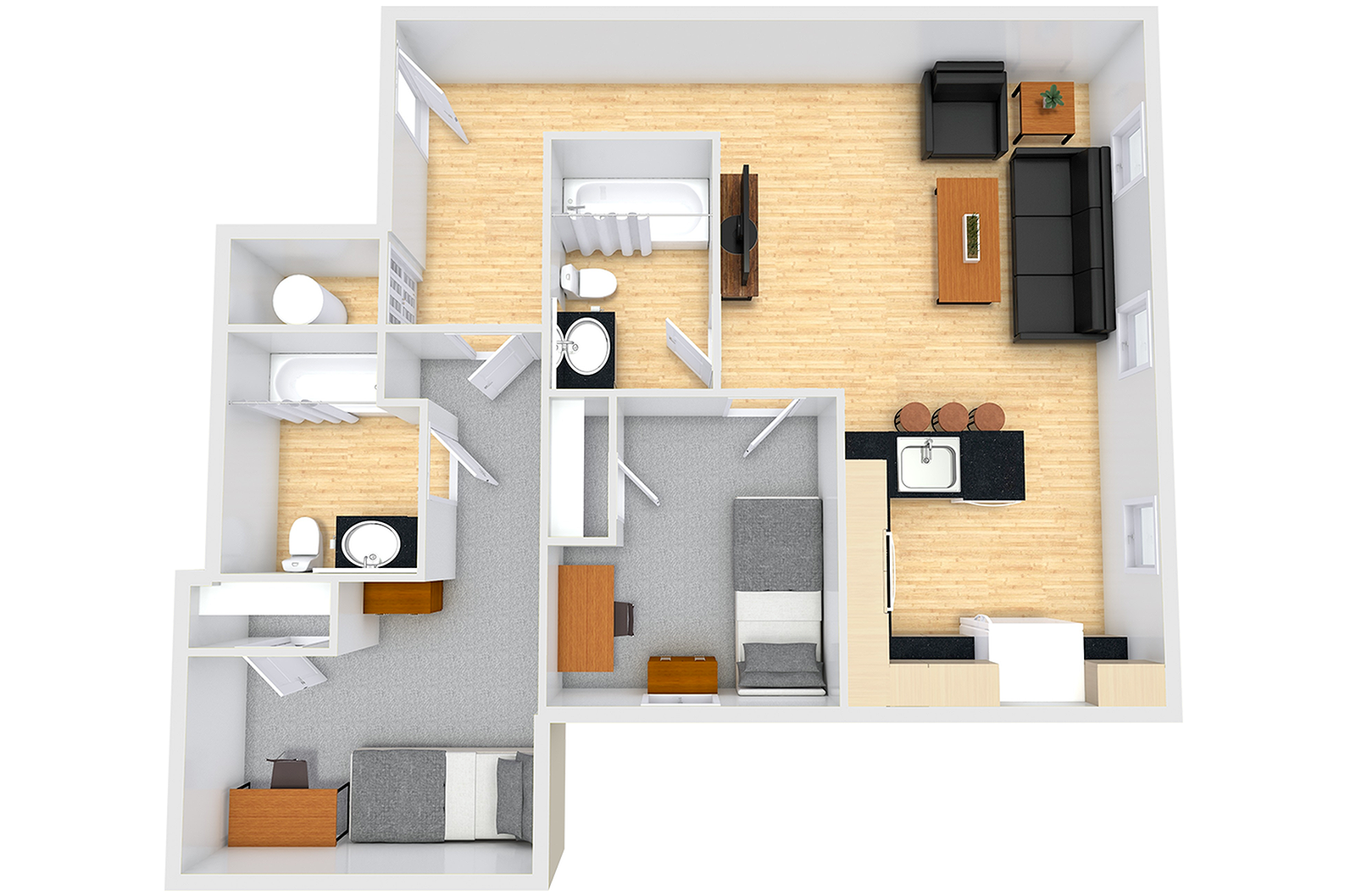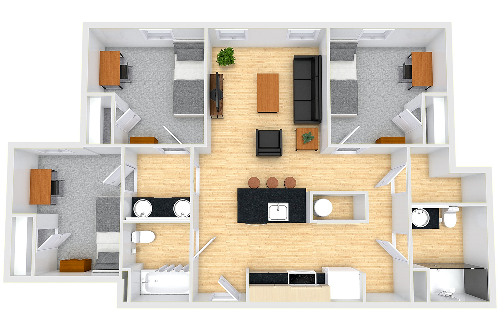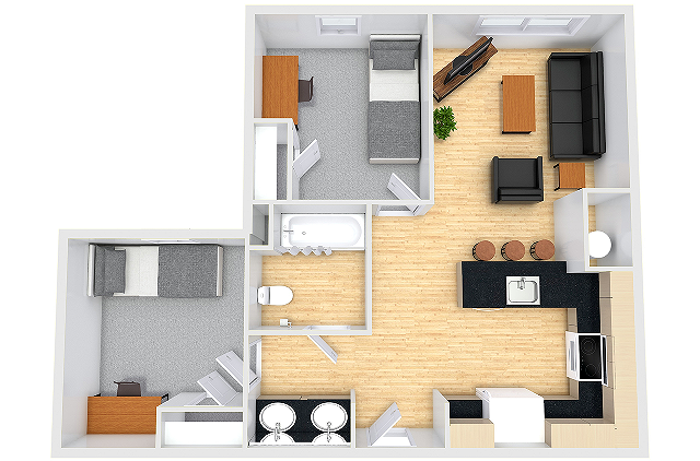 CP Cincy includes two, three and four-bedroom furnished apartments, which include all utilities, high-speed Wi-Fi, cable, dishwasher and more. Each room is furnished with a Full size bed for each resident.