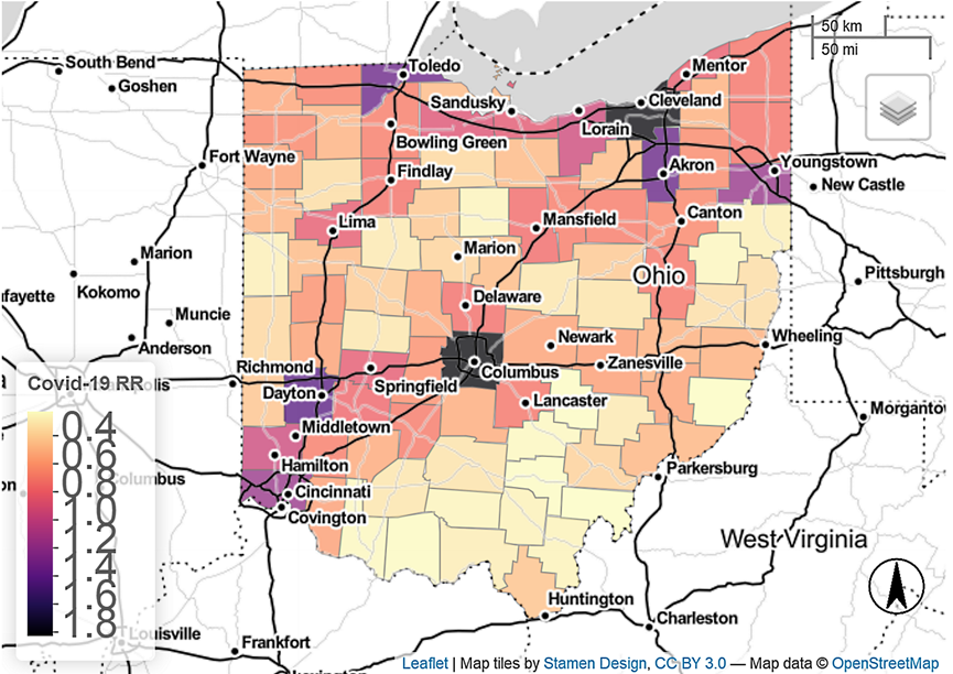 Diego Cuadros, assistant professor of geography in UC’s College of Arts and Sciences, released a new map of infection risk for Ohio’s 88 counties that shows the wide disparity between urban and rural areas. People living in many rural counties, particularly in southern Ohio, face as much as four times less risk of infection as those in larger cities and their suburbs.